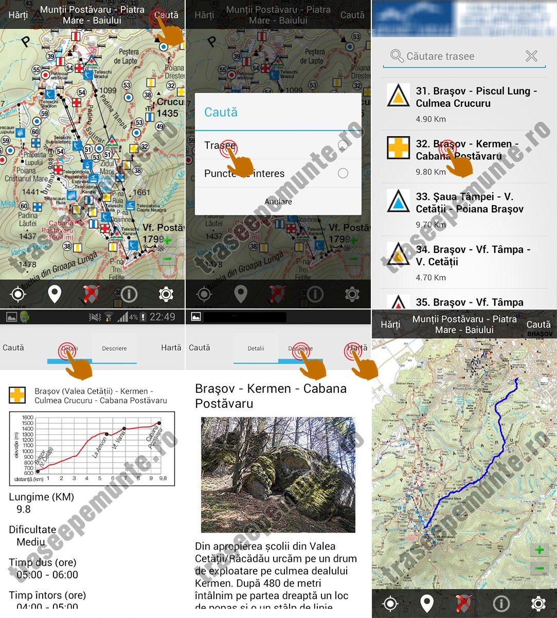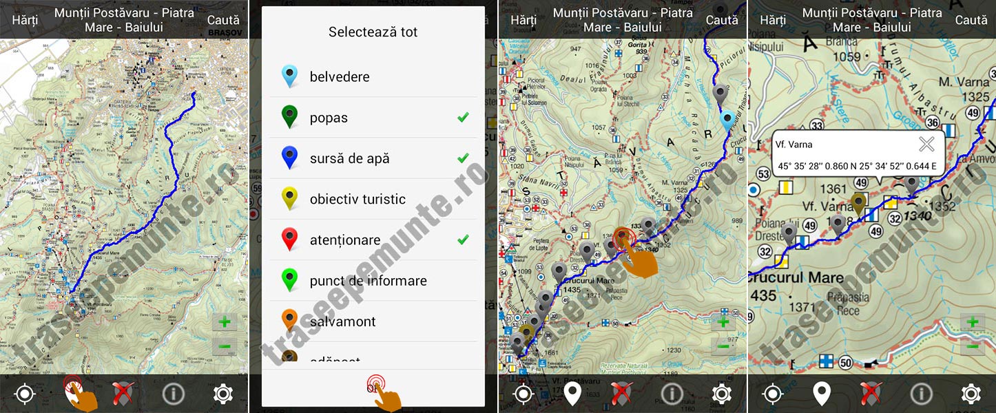 - optiunea de afisare a punctelor de interes aflate pe un traseu: izvor, cabana, loc de belvedere etc;