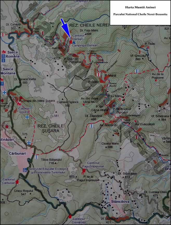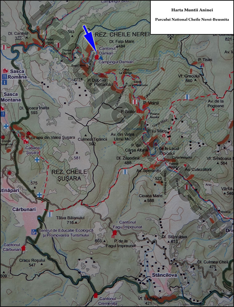 Cantonul Damian se afla in Cheile Nerei, pe traseul marcat cu banda rosie. Aceste loc de campare este neamenajat. Atentie, în zona sunt vipere!