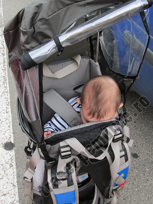 – atentie sporita si la crengile din jurul tau care pot lovi bebelusul, in special atunci cand mergi prin padure! Copilul fiind situat un pic deasupra, este destul de greu sa calculezi daca inaltimea la care este situata o creanga poate sa loveasca bebelusul din spate sau nu, fiecare dintre noi este obisnuit cu inaltimea lui. Din aceasta cauza se merge destul de des intr-un fel de semi mersul piticului, cu spatele cat mai drept. De asemenea, si de crengile aflate in lateral trebuie sa te feresti, dar si de cei din fata ta care in timp ce merg pot trage dupa ei o creanga care apoi poate lovi. Am descoperit ca in astfel de situatii husa de protectie solara este o bariera foarte utila, protejand bebelusul cu succes.