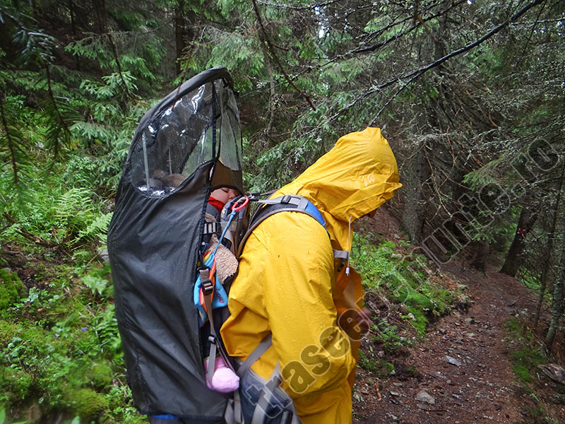 – atunci cand bate vantul sau sta sa ploua, anuleaza iesirea pe munte. Daca te-a prins ploaia sau vantul si nu ai unde sa te adapostesti, foloseste pelerina de ploaie a rucsacului. In general aceste pelerine de ploaie acopera foarte bine copilul, singura zona vulnerabila fiind zona picioarelor, pentru ca bebelusul isi va mai misca picioarele si este posibil sa se ude. De aceea, recomand in astfel de situatii, ca picioarele copilului sa fie acoperite si cu pungi de plastic sau orice alt material impermeabil.