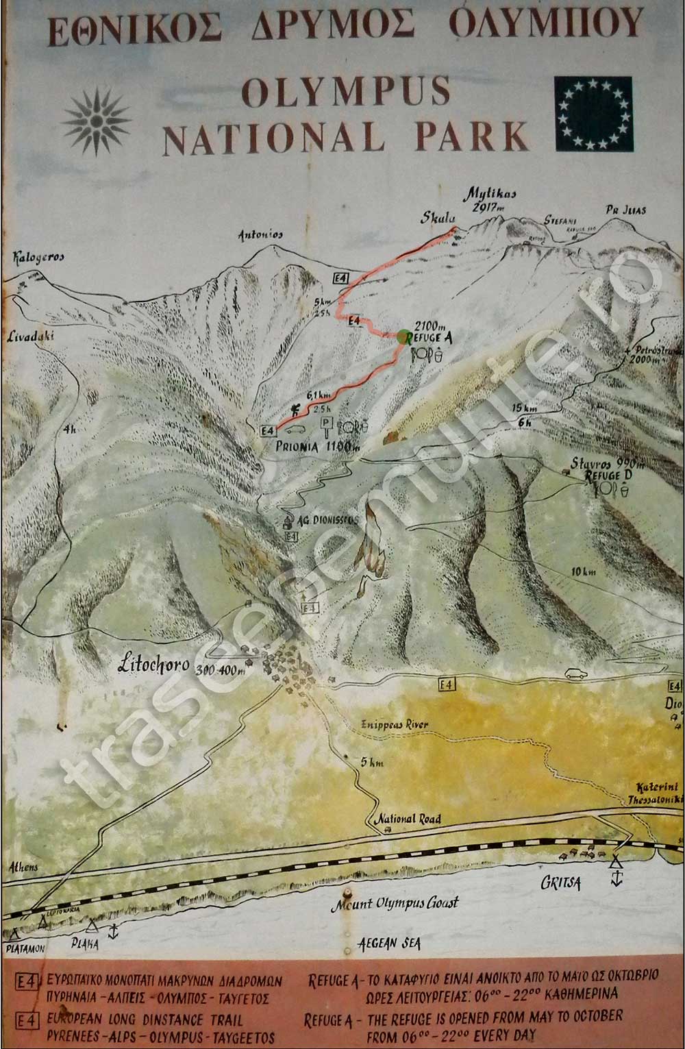 Traseu montan in Muntii Muntii Olimp, Grecia. Obiective turistice: Refugiul A sau Spilios Agapitos, culmea Chondhromesorachi, Varful Skala si Prionia.