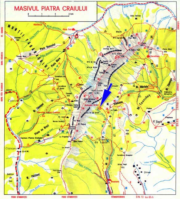 Localizarea Refugiului Grind: Muntii Piatra Craiului – sub Hornurile Grindului, la limita padurii
