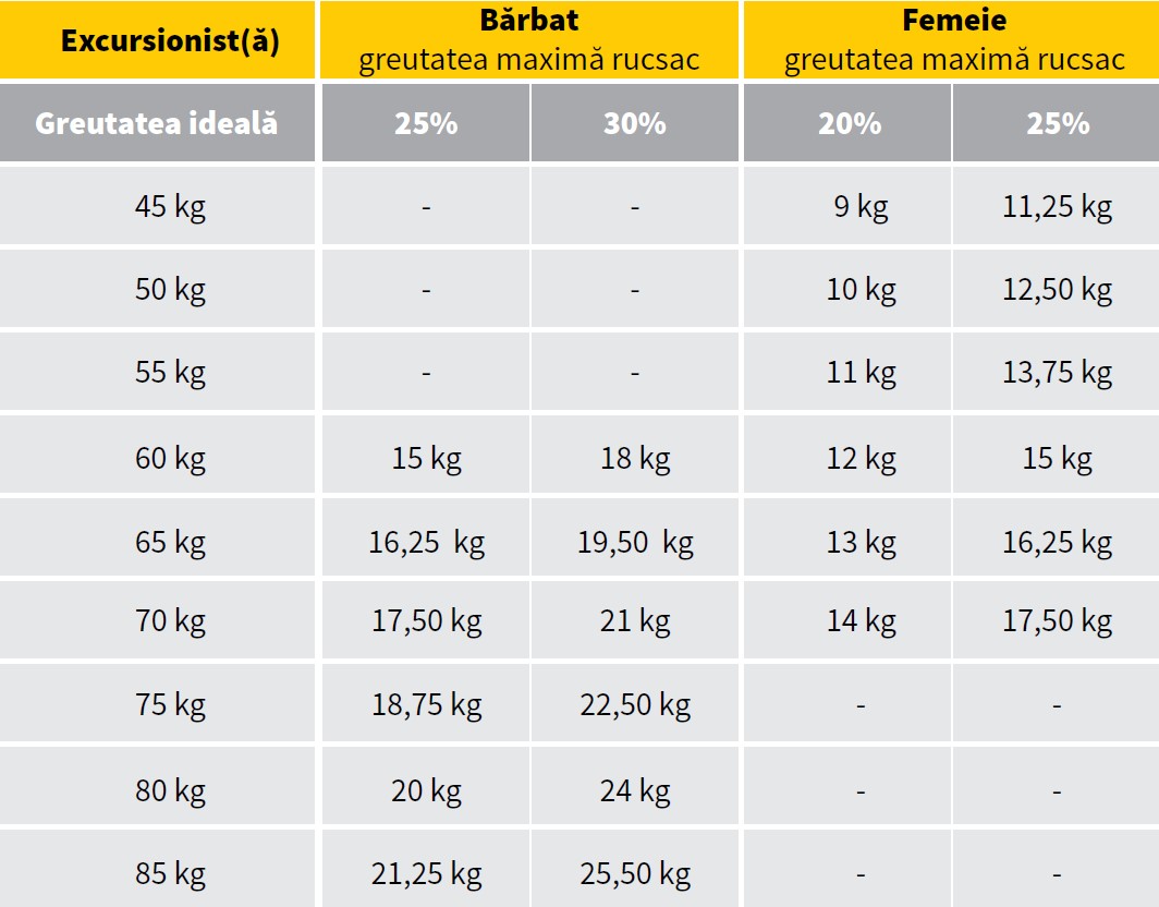 Greutatea maxima indicata pe care un turist cu o conditie fizica normala trebuie sa o transporte pe un traseu montan este de maxim 25% din greutatea lui corporala ideala. La femei greutatea rucsacului nu trebuie sa depaseasca 20% din greutatea ideala.
