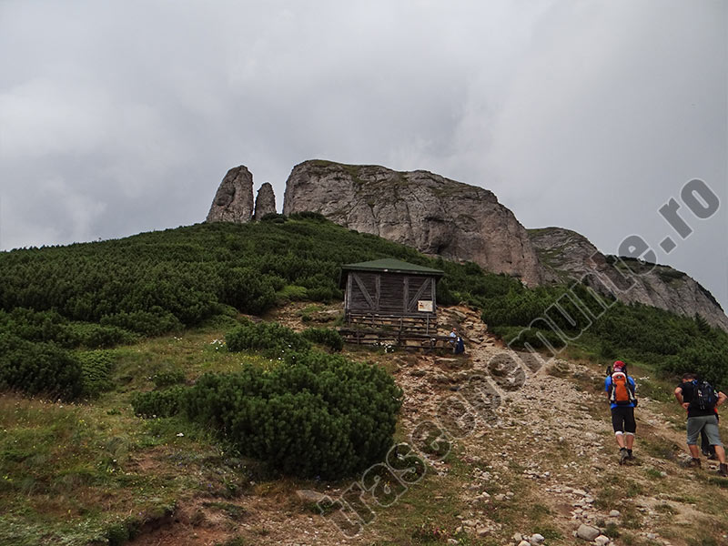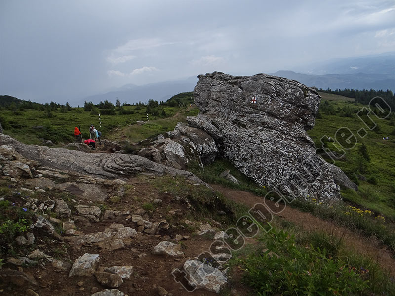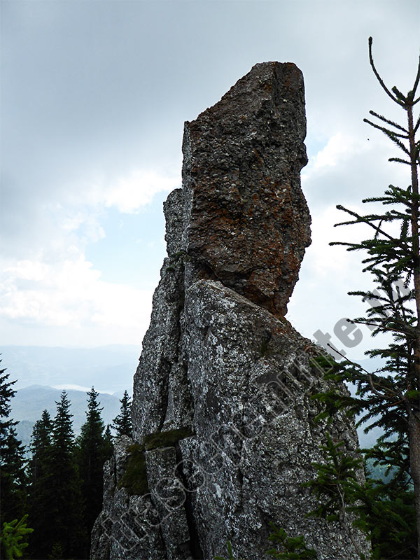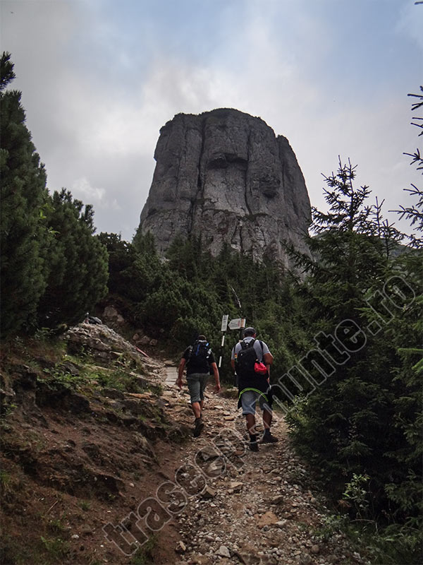 Trecem pe langa cateva bancute, loc perfect pentru un popas, intram in padure, pentru ca mai apoi sa inaintam printre jnepeni. In fata noastra se ridica o stanca uriasa, denumita Panaghia.