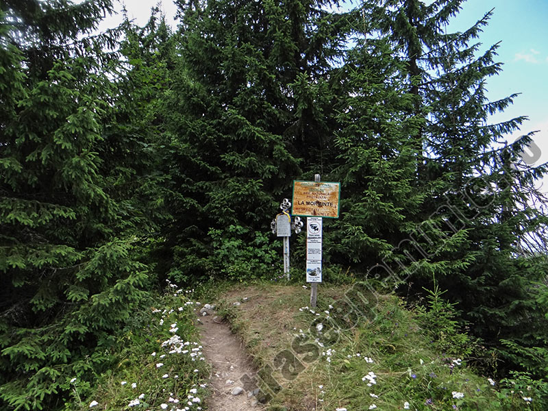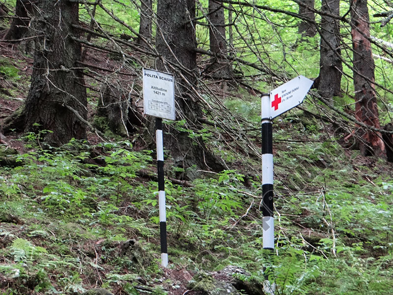 Inaintam pe traseul montan de pe platou si imediat dupa ce trecem de Piatra Lacrimata cotim spre dreapta, pe o carare nemarcata. Traseul „cruce rosie” continua pe platou pentru inca aproximativ 5 minute, insa noi am ales sa ne indreptam direct spre Curmatura Piciorul Schiop, loc in care gasim si un indicator de directie.