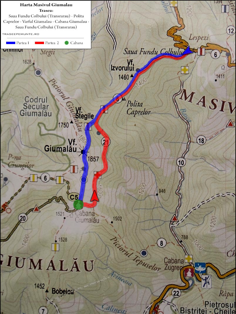 Saua Fundu Colbului (soseaua Transrarau/DJ175B) – Polita Caprelor – Cumpana de ape intre Bistrita (bazinul Paraului Colbu) si Moldova (bazinul Paraului Surii) – Crucea de pe Giumalau – Varful Giumalau