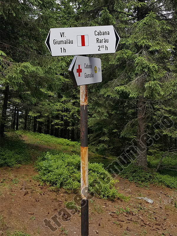 Urmeaza o portiune pe unde se urca mai accentuat, iar dupa aproximativ o ora si 15 minute de la intrarea pe traseu, suntem pe cumpana de ape dintre Bistrita (bazinul Paraului Colbu) si Moldova (bazinul Paraului Surii), adica pe muchia despartitoare dintre cele doua bazine hidrografice enumerate anterior. Aici ne intersectam cu marcajul „cruce rosie”, care duce direct spre Cabana Giumalau. Pe acest traseu ne vom intoarce. Noi continuam pe „banda rosie” pentru a ajunge pe Varful Giumalau.