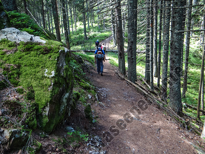 Ajunsi in desisul padurii, marcajul este usor de urmat. Cararea lata si bine intretinuta ne duce spre zona presarata cu stanci de mici dimensiuni si pietre denumita Polita Caprelor.