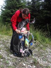 Rucsac transport copii pe munte. Rucsacul din imagine este dotat si cu pelerina de ploaie, dar si cu husa de protectie solara.