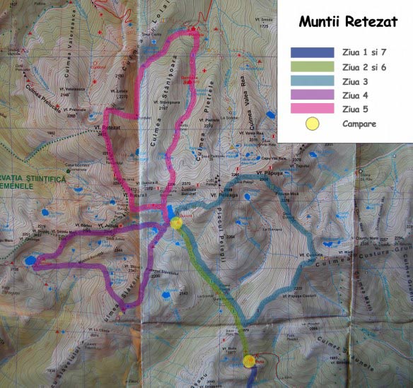 Traseu montan in Muntii Retezat. Obiective turistice: Poiana Pelegii, Lacul Bucura, Varful Peleaga, Varful Papusa, Varful Retezat, Cabana Pietrele, Cabana Gentiana si Lacul Zanoaga, Cabana Buta.