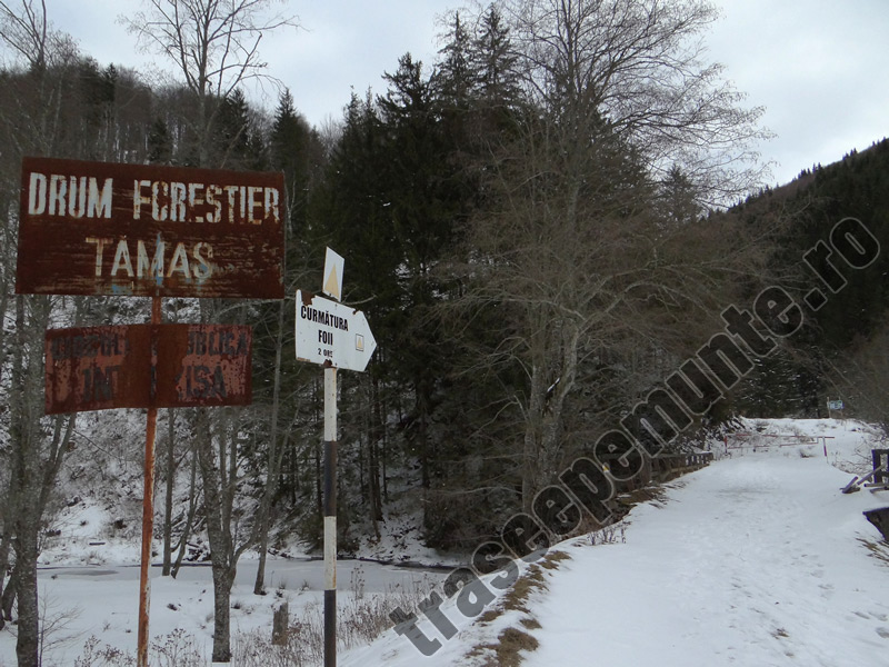 Curmatura Foii (1367 m) – Valea Tamas – drumul forestier Tamas – bariera – podul peste raul Dambovita – drumul comunal din Valea Dambovitei (DC 21) – Cabana Cascoe (910 m)