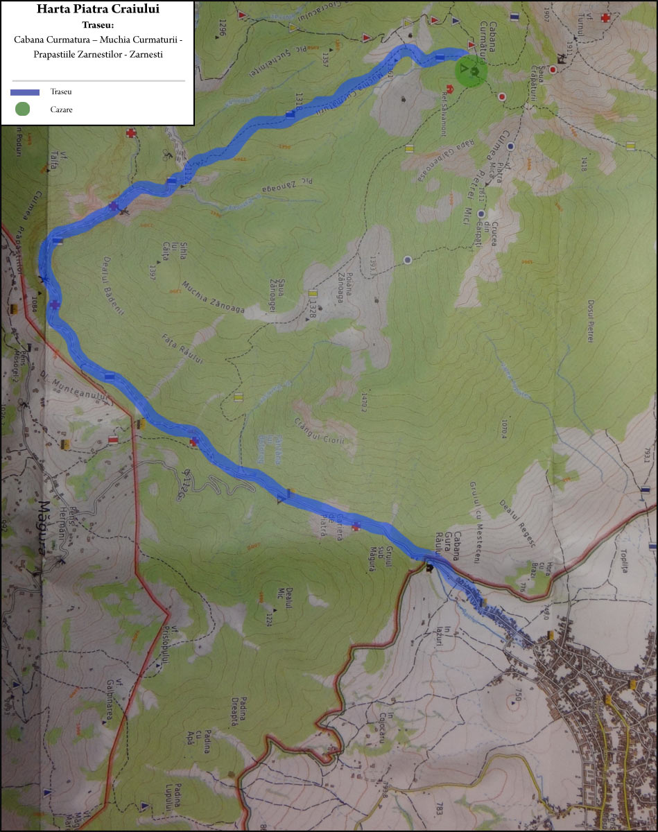 Cabana Curmatura (1470 m) – Poiana Curmaturii – Valea Curmaturii (1364 m) – Muchia Curmaturii (1318 m) – Prapastiile Zarnestilor [Cheia Pisicii – Refugiu Salvamont – Pestera Mare de la Prepeleac] – Valea Prapastiilor – Podul Magurii – Fantana lui Botorog – Cariera de piatra – Cabana Gura Raului (750 m) – Zarnesti