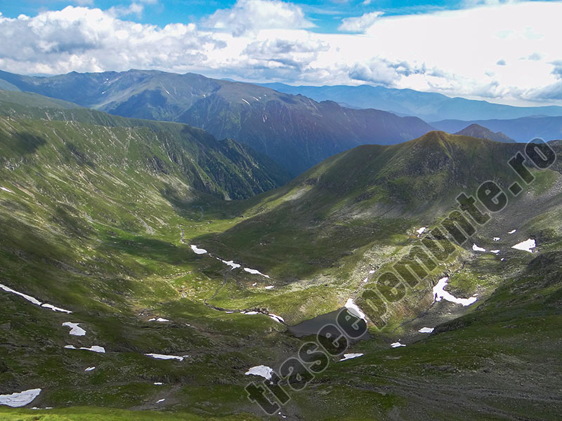 Caldarea Vaii Rele, Muntii Fagaras. Poza este facuta de pe Piciorul Moldoveanu si se poate observa si Iezerul Triunghiular sau Lacul Vestic din Valea Rea.