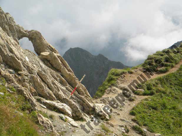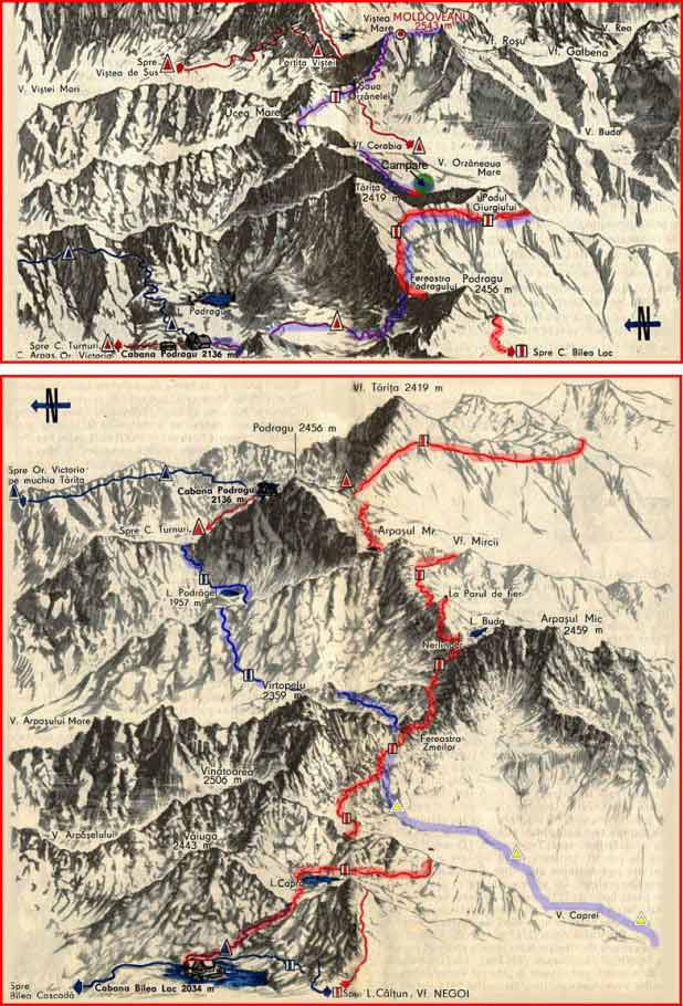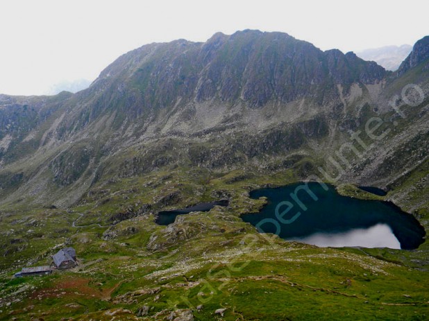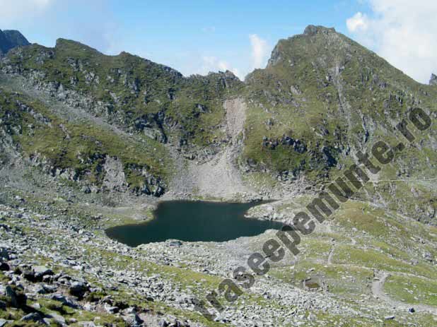 Cabana Podragu (2.136 m) – Curmatura dintre Lacuri (2.270 m) – Caldarea Podragelului – Lacul Podragel (1.957 m) – Strunga Podragelului (2.135 m) – Caldarea Vartopului – Caldarusa Fruntii – Strunga Portita Fruntii – Caldarea Pietroasa – Fereastra Zmeilor / Portita Arpasului