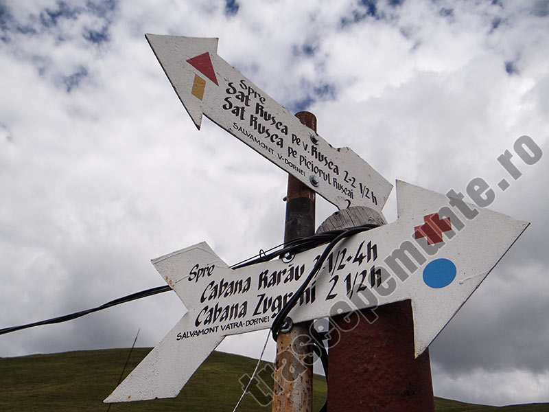 Cabana Giumalau-marcaj montan. Acest semn de directie se gasesti chiar langa refugiul turistic situat aproape de Varful Giumalau.