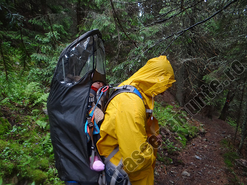 Pelerina pentru rucsac de transport copii pe munte. Rucsacul din imagine este dotat si cu pelerina de ploaie, dar si cu husa de protectie solara.